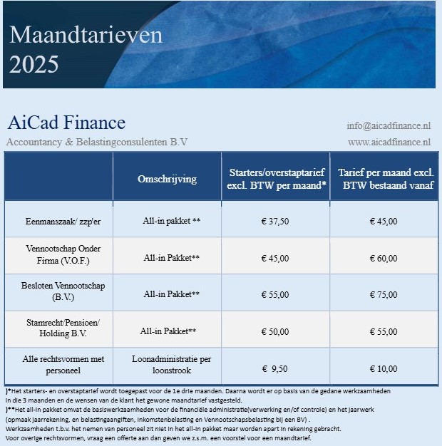 Onze jarenlange ervaring leert ons dat elk bedrijf anders is naast de gebruikelijke verschillen per sector en rechtsvorm. Het is dan ook niet mogelijk om een vast tarief te bepalen op basis van de sector, wensen klant en rechtsvorm. Om toch tot een reëel maandtarief te komen werken wij met een starterstarief voor startende bedrijven en een overstaptarief voor bestaande bedrijven die willen overstappen naar ons kantoor. In beide situaties worden deze tarieven voor de duur van minimaal 3 maanden gehanteerd. Hieronder een overzicht van deze tarieven per rechtsvorm. Download onze tarievenoverzicht of vraag een offerte aan via de linken hiernaast (voor mobiel, hieronder). Voor zelfstandigen in de zorg hebben we afwijkende tarieven, zie de link hiernaast.